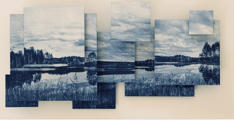 Camille, Marie et Philippe se sont prêtés à ce jeu avec deux photographies de nature finlandaise : une forêt de bouleaux et un lac sauvage. Chaque paysage possède donc sa version découpée et sa version en cyanotype. Toutefois, la collaboration va encore plus loin en proposant un troisième duo où les approches sont, cette fois, inversées : la photographie d’origine — un autre lac finlandais — est simplement tirée en couleurs sur un épais papier japonais tandis que le cyanotype est découpé par Philippe en fragments géométriques. Ces derniers sont soutenus par une armature en bois peint en turquoise et se détachent sur un fond en papier blanc. La couleur turquoise tranche avec le bleu de Prusse et se reflète en halos sur le fond conférant à l’ensemble une atmosphère vaporeuse et une dimension féerique.