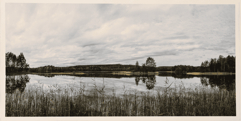 Le point de départ de cette collaboration est une photographie de paysage prise par Philippe lors de l’une de ses nombreuses promenades dans la nature finlandaise. Le photographe fait tirer deux clichés de ce paysage, puis les découpe en de multiples bandes de dimensions différentes. Il élabore ensuite des superpositions de ces bandes qu’il fixe sur un fond en papier blanc épais par l’intermédiaire de petits socles en bois peint qui créent ainsi une armature solide et visible si on se penche sur les côtes de l’œuvre. La photographie prend alors une nouvelle dimension aussi sculpturale qu’architecturale et invite le spectateur à s’aventurer dans une déambulation inattendue où recto et verso partagent la même importance. L’œuvre ne propose plus une vision linéaire d’un paysage mais offre une multitude de perspectives et amène le spectateur à le recomposer selon différents points de vue.